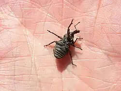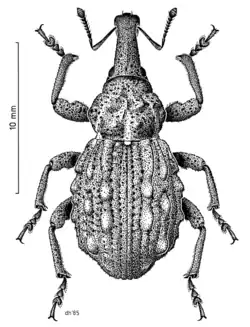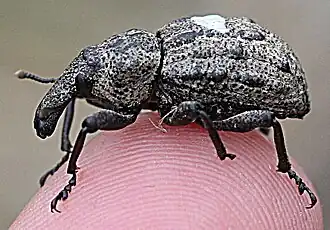 H. tuberculatus is a flightless weevil with a knobbed back. It reaches a length of 11.7–16.3 millimetres (0.46–0.64 in) and a width of 6.5–8.3 mm (0.26–0.33 in). It has a dark brown body with greyish-brown scales. This species tends to survive at high altitudes, specifically 670 meters, within the Department of Conservation reserve, where Aciphylla, a type of plant species, is abundant.[2] In addition, in a study done where the ecology and conservation status of the Hadramphus tuberculatus was measured, it was found that the population size decreased from 2009 through 2011 – with the estimated population sizes being 138, 90, and 76, respectively.[3]