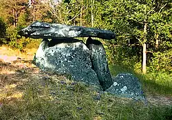 The grave site consists of four raised stone slabs, with a fifth slab placed as a roof, with an additional threshold stone by the entry and a stepping stone. It is surrounded by a small mound of earth, and some barely visible edge stones. While small in size, the dolmen has the province's largest inside chamber. It has a rough dating of about 3400 BCE.[3]