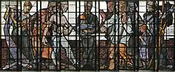 The Baroque Revival entrance building, opened on 14 September 1910, was built of brick and partly covered with sandstone. It survived bombing during the Second World War, although not completely, in contrast to other stations in the Ruhr area, so it can be admired today. A stained-glass window called The Artist as Teacher of Trade and Industry (German: Der Künstler als Lehrer für Handel und Gewerbe) by Johan Thorn Prikker was installed above the entrance by Karl Ernst Osthaus in 1911.[5]
