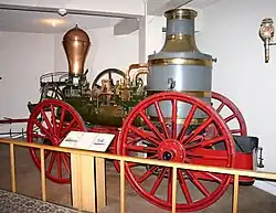 Old Betsy, a steam-powered fire engine from 1862, is displayed with other antique firefighting equipment in the Vehicle Gallery.