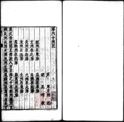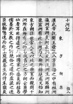 Hainei shizhou ji (traditional Chinese: 海內十洲記; simplified Chinese: 海内十洲记), also known by its shortened name Shizhou ji (traditional Chinese: 十洲記; simplified Chinese: 十洲记), also translated into English as Records of the Ten Continents,[1] Record of Ten Continents within the Seas,[2] and Notes on the Ten Regions on This Side of the Sea,[3] is an ancient Chinese collection of fantastic stories from the Han dynasty. The work is traditionally attributed to the Western Han dynasty scholar Dongfang Shuo (160-93 BCE). Alongside the Shenyijing and Bowuzhi, it is a prominent example of early Chinese fantasy.