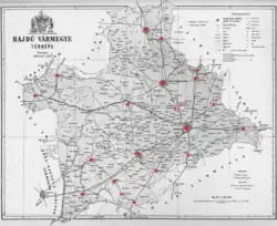 Hajdú county shared borders with the counties Heves, Borsod, Szabolcs, Bihar, Békés and Jász-Nagykun-Szolnok. The river Tisza touched its western border. The Hortobágy National Park steppe lies in the county. Its area was 3343 km² around 1910.