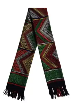 Women of this tribe chiefly wear pathin,[11] a wrap-around skirt that covered the upper and lower part of the body from the bust till the calf of the leg. Women in the upper class wore a long pathin which fell down to the floor while women in the lower class wore a shorter pathin which length reaches to the ankle. The pathin is a horizontally striped, colourful, rectangular piece of cloth with alternate layers of different colours between red stripes and thick horizontal borders. The pathin, also called pate or pâthni, consists of two main sets of stripes: the kan and the gao. If the pathin is observed with the stripes parallel to the horizon, the kan appears to be on the top and bottom ends of the pathin, while the gao is the larger central portion of the pathin. Red is the main colour used in the rangapathin, which is worn by young women; while middle-aged women tend to wear pathins with lesser stripes in shades of green. Women, while working on the fields use the kompes as a banong or belt. The compes is a brocaded scarf mostly used by men, but often women use it to tie their waists. Menfolk wear a woven piece of cloth called ningti or bhijâ kapur, it is worn in the fashion of a dhoti. During winters, both men and women cover their bodies with a traditional brocaded shawl called Argon[11] and men keep their necks warm with a kompes. Other kind of clothes used by the Hajongs are gamsa similar to the Assamese gamosa and pasra, an embroidered light shawl. Buksuli is the traditional shirt used by men.