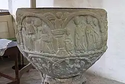 The church contains two medieval items of interest. It has a triumphal cross from the middle of the 15th century, probably made outside Gotland. The church also has a baptismal font made by the sculptor Hegvald. It has been described as one of the most interesting baptismal fonts on Gotland. Its reliefs depict the childhood of Christ but also other subjects.[1]