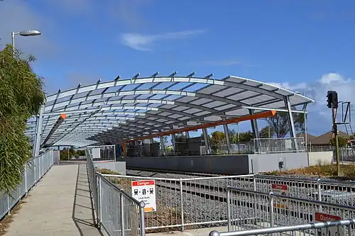 In 1959, a branch was approved to make Hallett Cove a junction with a branch from near the station to the Port Stanvac Refinery,[4] which was opened on 14 May 1963.[5] The Willunga railway line was cut back to Hallett Cove in 1969, and the Port Stanvac branch became the main line of the Christie Downs (later Noarlunga Centre, now Seaford) line in 1974. Once it became the main line, there was a siding on the western side of Lonsdale for the refinery, and a siding on the eastern side for the Chrysler (later Mitsubishi) engine factory which opened in 1967 and closed in 1983.[5] Both of these sidings were closed by the 1990s. More recently, the station was closed on 18 January 2010 for an eight-month rebuild which included building a canopy over the station.[6][7]