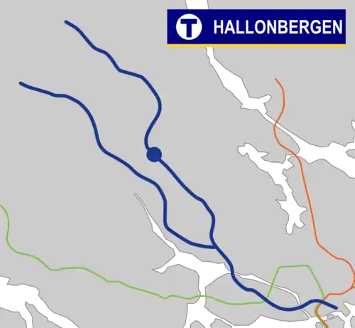 Between 1975 until 1985 Hallonbergen was the branching point for the Akalla and Hjulsta lines, as evident from its three-track layout. On 18 August 1985 the extension from Västra skogen to Rinkeby was opened, and the stretch between Hallonbergen and Rinkeby was closed for passenger traffic.[2]