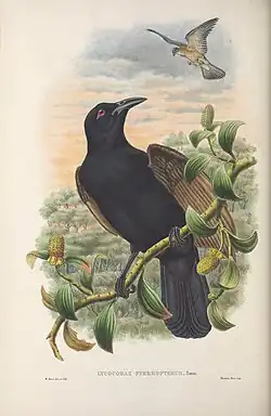 It was originally thought to be a crow (Corvidae), and was then reassigned to the birds of paradise, where it is the earliest known offshoot from the paradisaeid family tree, dating back approximately 17 million years in the Miocene period.[2] Lycocorax is derived from the Greek lycos, a jackdaw, and korax, a raven. Pyrrhopterus means red-winged.[5]