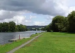 After Henley Bridge is the Henley river front with boat hire and a landing stage for riverboat cruises. After a small wooded island is the larger Rod Eyot, and Mill Meadows provides public open space on the Henley side of the river. The River and Rowing Museum is situated here. On the Berkshire bank the land rises steeply with a wooded escarpment hanging over Marsh Lock.