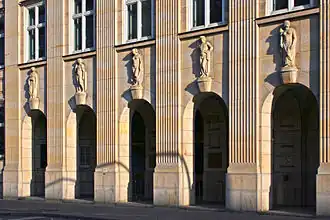 The Hamburg police authority had been using the Hamburger Stadthaus as its central office since 1814.[13] During the Weimar Republic and the National Socialist regime, the Hamburg State Police and subsequently the Gestapo were also housed in the extension to the Stadthaus at Stadthausbrücke 8 until 24/25 July 1943, alongside other police departments.[14] After the town hall was destroyed by bombing during Operation Gomorrah following air raids by the Royal Air Force, the office of the State Police Headquarters was temporarily relocated to rooms in the school administration at Dammtorstraße 25. After several weeks, premises in the Civil Justice Building on Sievekingsplatz finally became the headquarters of the State Police Headquarters until the end of the war.[15]