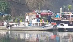 The ferry currently operates between a floating boathouse on the north bank of the Thames and on the south bank, a rudimentary jetty used at high tide and a set of stairs in the embankment used at low tide. The boathouse is also in use as a private mooring for leisure craft.[12] Weather permitting, the ferry operates on weekends year-round, and weekdays between February and October.[13] As well as the ferry service, rowboats, canoes and motorboats can also be hired from the boathouse.[14]