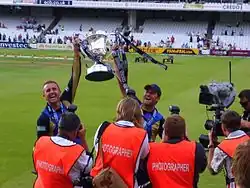 Former captain Shaun Udal also announced his retirement, having played for Hampshire since 1989,[30] though he later joined Middlesex. Dimitri Mascarenhas was named Warne's replacement as captain for the 2008 season.[31] In 2008, Hampshire struggled and were near the foot of the Division 1 table for the majority of the season. Midway through the season coach Paul Terry stood down and was replaced by Giles White. A series of strong performances helped Hampshire go from relegation favourites to title outsiders going into the final round of matches. The club ended up finishing in third place, twelve points behind winners Durham.[32] On 25 July the club won the 2009 Friends Provident Trophy final at Lord's, beating rivals Sussex[33] thanks to a man-of-the-match performance from Dominic Cork, with him taking 4/41. Hampshire created history by winning the 2010 Friends Provident t20 in front of home support after defeating Somerset – the first team to win a Twenty20 trophy on home turf in England and Wales. On 14 September 2011, in their four-day game against Warwickshire at The Rose Bowl, Hampshire were officially relegated to the County Championship Second Division. The 2012 season though, under new captain Jimmy Adams after the retirement of Cork, would prove to be highly successful for Hampshire with the county winning both the 2012 Friends Life t20[34] – their 2nd Twenty20 title, and the 2012 Clydesdale Bank 40 where a final ball dot ball from Kabir Ali led to Hampshire winning as a result of losing less wickets than opponents Warwickshire.[35] Club legend Dimitri Mascarenhas played in both finals but retired at the end of the 2013 season.