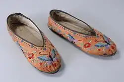 Embroidered shoes | Also known as Chinese shoes, Chinese-style embroidered shoes, and Chinese slippers, are a well-known sub-type of traditional Chinese cloth shoes (中国布鞋);There are many shoe styles. The xiuhuaxie are characterized by its use of elaborate and colourful Chinese embroideries to create pattern on the shoes.The traditional handicraft of making xiuhuaxie is fully indigenous to China. | Spring and Autumn period – present day |