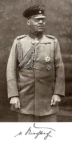 Within months of retirement, the First World War broke out. Kirchbach was reactivated and was assigned as the commanding general of the XII (Royal Saxon) Reserve Corps, part of the predominantly Saxon 3rd Army on the right wing of the forces that invaded France as part of the Schlieffen Plan offensive in August 1914. He served with this corps on the Western Front over the next three years. He fought in 1914 in the First Battle of the Marne, in 1915 in the First Battle of Champagne, in 1916 in the Battle of the Somme and at the Battle of Passchendaele at Ypres in 1917.[2] For his service as a corps commander, he was decorated with the Pour le Mérite on 11 August 1916.[1]