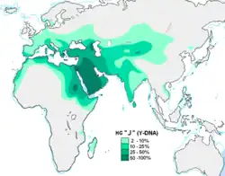 Haplogroup J-M304, also known as J,[Phylogenetics 1] is a human Y-chromosome DNA haplogroup. It is believed to have evolved in the Caucasus or Iran.[2][3] The clade spread from there during the Neolithic, primarily into North Africa, the Horn of Africa, the Socotra Archipelago, Europe, Anatolia, Central Asia, South Asia, and Southeast Asia.