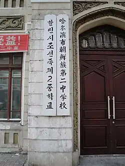 The No. 2 Korean Middle School is located at 86 Tongjiang Street, Daoli District, in a building constructed in the late 1910s. The same building once housed the city's Jewish Middle School; it is listed by the municipal government as a second-class preserved historical building.[7]