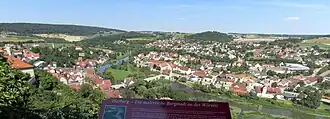 ![]() ![]() From top: castle and town, old stone bridge with Wörnitz River and in the background St. Barbara and Herz Jesu, Harburg Castle, view from the castle on the town | |
