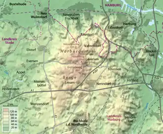 The Harburg Hills (German: Harburger Berge) are a low ridge in the northeastern part of the German state of Lower Saxony and the southern part of the city state of Hamburg. They are up to 155 metres (509 ft) high.