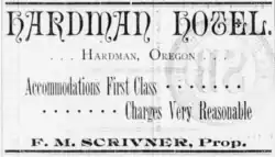 1892 advertisement for the Hardman Hotel (Hardman, Oregon) published in the Heppner Gazette (Heppner, Oregon).