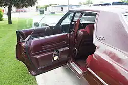 1976 Chrysler New Yorker with doors open. Note the absence of a driver's vent window and half-height pillar to which the rear doors attach.
