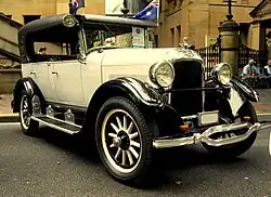 Another form of early pillarless hardtop is the "California top", originating in Los Angeles and most popular from 1917 to 1927.[12][14] These were designed to replace the folding roofs of touring cars, to enclose the sides of the car for better weather protection.[15] One objective of these aftermarket tops was to bring the cost of the closed car nearer to the prices of corresponding open cars.[16] Automobile dealers were encouraged to equip an open car with a California top to demonstrate that they were "cool and clean in summer, and warm and dry in winter."[17] The hard tops were frequently equipped with celluloid windows that retracted like a roller blind for open sided motoring offering a low-cost compromise between an open and closed car.[18]