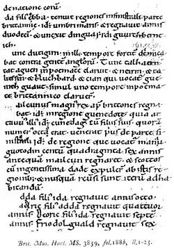 The Harleian genealogies are a collection of Old Welsh genealogies preserved in British Library, Harley MS 3859. Part of the Harleian Library, the manuscript, which also contains the Annales Cambriae (Recension A) and a version of the Historia Brittonum, has been dated to c. 1100, although a date of c.1200 is also possible.[1]