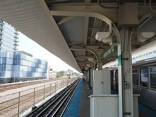 Station platform, looking east. The Oak Park Metra station can be seen in the background.