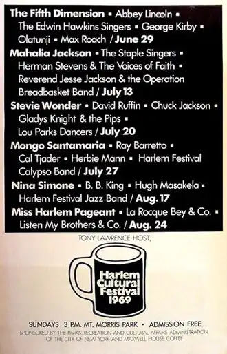 Lawrence also hosted and directed the 1969 festival, held in Mount Morris Park on Sundays at 3 p.m. from June 29 to August 24, 1969. Sponsors included Maxwell House Coffee, and what was then the Parks, Recreation, and Cultural Affairs Division of the City of New York (later separated into Parks and Recreation and Cultural Affairs).[7] Lawrence secured a wide range of performers including Nina Simone, B.B. King, Sly and the Family Stone, Chuck Jackson, Abbey Lincoln & Max Roach, the 5th Dimension, David Ruffin, Hugh Masakela, Gladys Knight & the Pips, Stevie Wonder, Mahalia Jackson, Mongo Santamaria, Ray Barretto, and Moms Mabley, among many others. The Woodstock rock festival also took place in August 1969, and the Harlem festival then became known informally as the "Black Woodstock".[8][9]