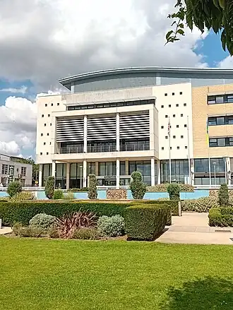 The new complex was designed by Benoy Architects in the modern style,[15] built in concrete and glass and was officially opened by Prince Richard, Duke of Gloucester on 19 May 2004.[16] The design involved an asymmetrical main frontage facing south onto the gardens. The civic centre was at the west end of the complex and featured a three bay rectangular portico formed by columns supporting a balcony and a series of huge louvres on the first floor. Internally, the principal room was the council chamber, located behind the louvres.[17][18] The proclamation of King Charles III was read out from the balcony on 11 September 2022.[19]