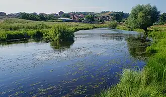 The river takes its source from the Velichka spring at an altitude of 755 m, situated near the second class II-58 road Asenovgrad–Kardzhali some 1.5 km west of the Panichkovo resort in the Eastern Rhodope Mountains.[1] It flows in a deep forested valley until the village of Boyan Botevo, where it turns southeast and flows through the Haskovo hills in a narrow shallow valley. Downstream of the village of Malevo the Harmanliyska reka turns in northeastern direction and after Stoykovo it bends eastwards, bypassing the Huhla ridge from the north in a valley with steep slopes on the right bank and oblique slopes on the left one.[1] It forms a 9–10 gorge before reaching the town of Harmanli, where the river flows into the Maritsa at an altitude of 73 m about 1.3 km northeast of the town. [1][2]