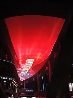The square can be divided into 5 functional regions, including business, recreation, catering and so on. The most notable spotlight is the 500-meter long LED screen above the walkway, the Suzhou Sky Screen currently the world's largest video screen.[2] The screen consists of 20 million LEDs. Jiuguang Department Store is the biggest store there.