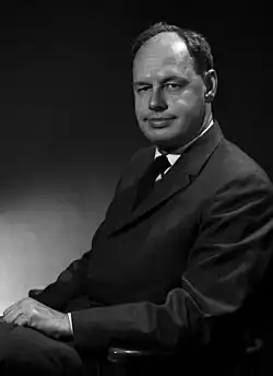 Fidler also submitted regular reports on the activity of the Radiation Laboratory to the director of the Manhattan Project, Brigadier General Leslie Groves, and briefed him, on his visits to Berkeley, which were made about once a month between October 1942 and November 1943.[5][6] As part of his role in coordinating the electromagnetic process, Fidler occasionally visited Chicago, which was more convenient for contractors like Westinghouse, General Electric, and Allis Chalmers; Boston, where the offices of Stone & Webster, the main engineering contractor were located; and the production facilities at the Clinton Engineer Works in Oak Ridge, Tennessee.[4] He attained the rank of major.[7] After World War II ended in August 1945, Fidler was transferred to Tennessee, where he worked on the declassification of Manhattan Project documents. He was awarded the Legion of Merit for his work on the Manhattan Project,[1] which was presented by Groves at a ceremony at Lawrence's home on October 21, 1945.[7]