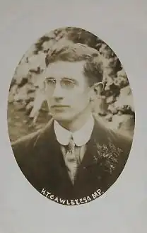 The 42nd Division went to Gallipoli in 1915. During September the Turks exploded a series of mines in front of the British trench known as the 'Gridiron' and damaging its defences. Repairs after one mine on 22 September were covered by a bombing party of 1/6th Battalion Manchester Regiment who held the lip of the crater. The same day the Royal Engineers exploded a counter-mine and the Manchesters rushed the crater and built a barrier across it. Captain Cawley, serving with 1/6th Bn, was killed that night by a Turkish sniper, and the crater became known as 'Cawley's Crater'.[4][5] Before his death, he sent a letter to his father, at that time representative of Prestwich in the Parliament of the United Kingdom.[3]