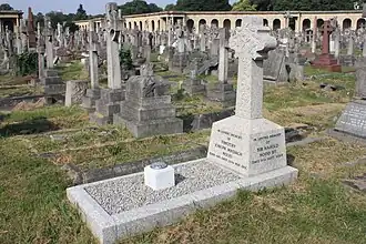 He is buried in the central roundel of Brompton Cemetery in London towards the south-west.