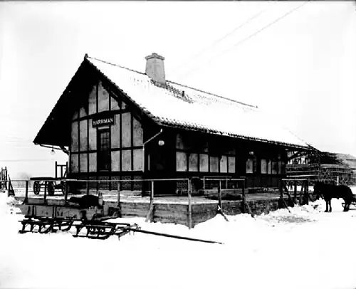 The 1873 station depot as photographed with the HARRIMAN name sign in June 1910 during the naming debates between Turner and Harriman