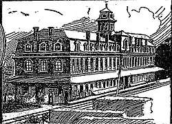 The first station in Harriman, New York, then known as Turner, was first constructed around 1838 by Peter Turner, as one of the many stretches of the New York and Lake Erie Railroad was constructed through the town. The station itself was a 400 feet (120 m) long brick depot, three stories tall, and topped with a French roof. The station sat alongside the railroad tracks and was called the Orange Hotel.[2] The dining room of the new structure was able to hold 500 people at a time and accommodate them with good food.[3] During the planning of the Erie, there was some concern to whether or not the railroad would work its way through Harriman at all, instead of bypassing nearby Goshen and Middletown in favor of a terminus at Newburgh, also on the Hudson River.[4] Train service to Harriman began in 1841, when the New York and Lake Erie ran its first trains on June 30, 1841, from Piermont-on-Hudson, the determined eastern terminus, to Goshen, the western end.[5]