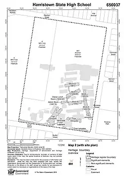 1. ^ a b c d e f g h i j k l m n o p q r s t u v w x y z aa ab ac ad ae af ag ah ai aj ak al am an ao ap aq ar as at au av aw ax ay az ba bb bc bd be bf bg bh bi bj bk bl bm bn bo bp bq br bs bt bu bv bw bx by bz ca cb cc cd ce cf cg ch ci cj ck "Harristown State High School (entry 650037)". Queensland Heritage Register. Queensland Heritage Council. Retrieved 14 February 2018.