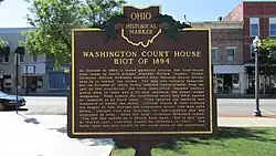 On October 9, 1894, a black man named William Dolby was accused of assaulting a white woman named Mary C. Boyd in her home at Parrett's Station, a small settlement near Washington Court House.[16] Dolby fled but was soon arrested and taken back to the jail at Washington Court House, where signs quickly pointed to an outburst of mob violence.[17] Dolby supposedly confessed to the crime "upon being apprehended".[16] The Fayette County sheriff called upon Governor McKinley to send out the militia to defend the prisoner from a prospective lynch mob following his sentencing to twenty years in prison at a hearing held on October 16.[17]