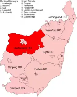 Hartismere Rural District was a rural district in the county of East Suffolk, England. It was expanded in 1934 by merging with the disbanded Hoxne Rural District with a slight readjustment of boundaries.[1] It was named after the ancient Hundred of Hartismere and administered from Eye.