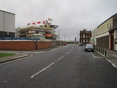 The York, Newcastle & Berwick Railway was amalgamated with other companies to form the North Eastern Railway in 1854 and in 1877 the NER constructed a line linking the former HD&R directly to the former Stockton & Hartlepool Railway in West Hartlepool.[1] As part of the rationalisation of the rail network around Hartlepool, the NER opened a new terminus at Hartlepool, west of the original station, on 16 November 1878[3] and a new through station at West Hartlepool two years later.[1] Following the opening of the new station, the original one was converted into a goods shed.[2] The growth of West Hartlepool, combined with the decline of "old" Hartlepool led to the diversion of passenger services from the former HD&R and GNEC&HJR lines into West Hartlepool station, leaving Hartlepool as the terminus of a shuttle service between the two towns.[4]