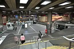 Harvard station has a complex structure located largely under triangular Harvard Square, from which Massachusetts Avenue runs to the north and east and Brattle Street to the southwest, and under the surrounding streets. The main lobby is located under the square itself, and approximately matches its triangular shape. The glass-and-steel main headhouse is located in a sunken concrete plaza at the south end of the square.[2] The plaza, locally known as "the Pit", plays host to homeless people, street artists, skateboarders, and activists.[3][4] Passengers descend eastward from the headhouse on a bank of stairs and elevators, then turn and descend northwest on a second escalator bank into the lobby. An elevator is located adjacent to the headhouse; the station is fully accessible.[2]