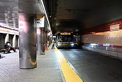 A project to make repairs to the deteriorated pavement, replace the trolleybus wire, replace lighting, improve wayfinding, and add automatic doors to the main station area is taking place in 2019 and 2020.[7] On June 23, 2019, the upper busway was temporarily closed; most buses used the lower busway for boarding and surface stops for alighting, while routes 71 and 73 ran on the surface only.[7] The upper busway reopened and the lower busway closed on October 21.[99] The lower busway reopened on November 22, with the upper busway again closed until December 21.[100][101] Additional closures of the lower busway took place from March 31 to May 2 and June 21 to December 21, 2020, as decreased ridership during the coronavirus pandemic allowed for faster construction.[101][102][103] The upper busway was again closed from June 20 to July 29, 2021, with the lower busway then closed until August 29.[104][105][106] Improvements to wayfinding signage and lighting in the station began in 2020 but were suspended during the COVID-19 pandemic.[107] Trolleybus service ended on March 13, 2022, with routes 71 and 73 rerouted to board in the upper busway.[14]