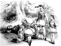 Tuckett involved himself in many ventures after leaving the Army, experiencing, as an annual news review recounted: "much of life, as a merchant, agent, actor, and bankrupt".[15] Because of his duelling injury he walked with a limp for the rest of his life, but he recovered sufficiently to become a player with a company of actors touring in Britain and Ireland, drawing on his experience of amateur theatre in India. Reactions to his stage appearances were often critical but, by capitalising on his celebrity from the duel, Tuckett gained backing for a production of Henry IV Part 1, in which he played Sir John Falstaff.[16] His performance in the role at London's Lyceum Theatre, opening on 12 January 1844, gained appreciative reviews, although the production itself was criticised for its sparse scenery and indifferent supporting cast—some were amateur players.[17][18] A critic noted that the actor's naturally stout physique rendered unnecessary the heavy padding customarily needed to portray the old, fat knight.[19] The final performance, in what was considered a very short run in front of "empty benches",[20] was a benefit performance for Tuckett on 12 February 1844.[21]