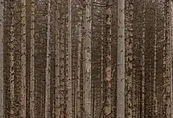 There are various vegetation zones in the Harz National Park. In the sub-alpine area above 1050 metres is the "battle zone" of the spruce tree. Here it is not uncommon to find trees over 250 years old and bent into bizarre shapes by the wind. But predominant here are the dwarf shrub heaths and raised bogs (Hochmoore). The altimontane vegetation zone is found between 750 m above sea level (NN) and 1,050 m above NN, dominated by spruce. These areas can be found in the vicinity of Schierke and Torfhaus. Not until the montane zone between 450 m above NN and 750 m above NN and the submontane zone is the vegetation dominated by beech forests. Today's beech stands grow primarily on acidic soil. The most commonly encountered forest type is the Hainsimsen beech forest. At heights above 700 m it is usually adjacent to spruce-beech mixed woodland. But in the national park this area has shrunk to just a few residual stands and has been largely replaced by spruce. In the region of Ilsenburg spruce monoculture occurs even down to 230 m above NN. In these zones the spruce is not native and, as a result of climate change, it has suffered increasingly from bark beetle infestation. Currently the National Park Service is having these areas reforested to encourage the original beech and maple, that used to dominate them, to resettle.[4][5][6]