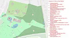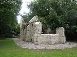 During World War II, Haus Weitmar was hit by bombs during an air raid on 13 May 1943, and burned down to the outer walls. The library of the house, which contained many thousands of volumes, was also lost.[9] The outer castle building from the late 19th century remained intact, but was demolished and completely leveled in 1968. In the same year, Alexander von Berswordt-Wallrabe founded Galerie m Bochum in the adjacent area of the castle. The ruins of the manor house and chapel were saved from final decay in the 1970s thanks to the initiative of the Kunstverein Bochum.[19] In 1974, the city of Bochum leased the park, which had meanwhile become overgrown, and restored it by 1978, subsequently opening it to the public.[11] The opening of the park to the general public and the simultaneous opening of Galerie m were accompanied by the placement of contemporary sculptures in the park. When the lease expired in 2000, conservation measures were necessary on the ruins because tree roots were endangering the masonry.[19] The cost of restoration was estimated at 290,000 euros, but neither the city nor the owner wanted to pay.[19] In September 2005, the remains of both structures had to be closed off with construction fences because falling chunks of stone were endangering visitors.