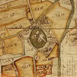 It was probably not until the 16th century that Haus Weitmar received the status of a knight's seat.[1] After a firebombing by Spanish soldiers in 1588, a new building had already been erected in 1592 by Johann's father of the same name. For a long time, this was considered by researchers to be a new manor house, but this was refuted by excavations in 2009, which allowed the construction phases of the main house to be dated to other times.[12] It is more likely that a second manor house was built as a result of the division of the fiefdom between the von Hasenkamp and von Eickel families.[7] On a map from the year 1780, a building can be seen in the outer castle area, which was only slightly smaller than the actual main house. This could have been the new building from 1592.[7] In 1823, however, it had already been demolished, because on the original Westphalian map from that year it was already marked as demolished.[7] The building is still visible on the map.