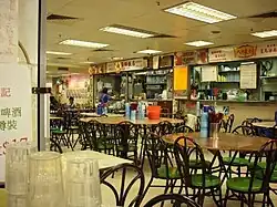A hawker centre (simplified Chinese: 小贩中心; traditional Chinese: 小販中心), or cooked food centre (Chinese: 熟食中心), is an often open-air complex commonly found in Hong Kong, Malaysia, Singapore, and Indonesia. They are intended to provide a more sanitary alternative to mobile hawker carts and contain many stalls that sell different varieties of affordable meals. Tables and chairs are usually provided for diners.
