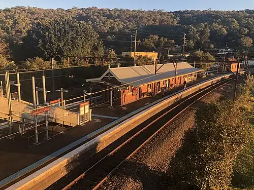 In 1960, electrification of the Hornsby-Gosford section of the line was completed. The station footbridge was raised, and modifications and improvements were carried out to trackwork, sidings and signalling to suit the use of electric locomotives and the future operation of stainless steel electric interurban car sets on passenger trains. The signal box was closed. In the late 1980s and early 1990s some additional awnings and structures have been added on the platform. The station steps have been rebuilt with modern materials.[4]
