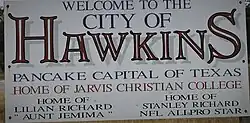 Hawkins is a city in Wood County, Texas, United States. The population was 1,274 at the 2020 census. It is located twenty miles north of the larger city of Tyler. Just east of the community is Jarvis Christian University, a historically black institution of higher learning.