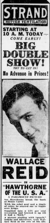 Hawthorne of the U.S.A. is a 1919 American silent comedy adventure film directed by James Cruze and starring Wallace Reid and Lila Lee.[1] The film is based on the play of the same name by James B. Fagan. It had run on Broadway in 1912 with Douglas Fairbanks in the title role.[2] The scenario for the film was written by Walter Woods. The film was produced by Famous Players–Lasky, and distributed by Famous Players under the Paramount-Artcraft Picture banner.[1][3]