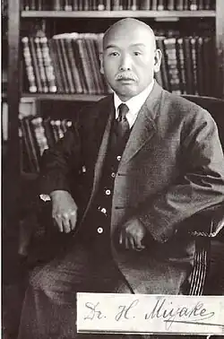 Hayari Miyake (Japanese: 三宅 速, romanizedMiyake Hayari; 16 March 1866 – 29 June 1945) was a Japanese surgeon specializing in gastrointestinal and central nervous system surgeries. He was an assistant to Julius Scriba, a professor of surgery at Tokyo Imperial University, and later became a student of Jan Mikulicz-Radecki, a German-Polish-Austrian surgeon. Miyake headed the Department of Surgery at Kyushu Medical School, where he taught Hakaru Hashimoto, the discoverer of Hashimoto's thyroiditis. Miyake served as the president of the Japan Surgical Society and was a long-time friend of theoretical physicist Albert Einstein.